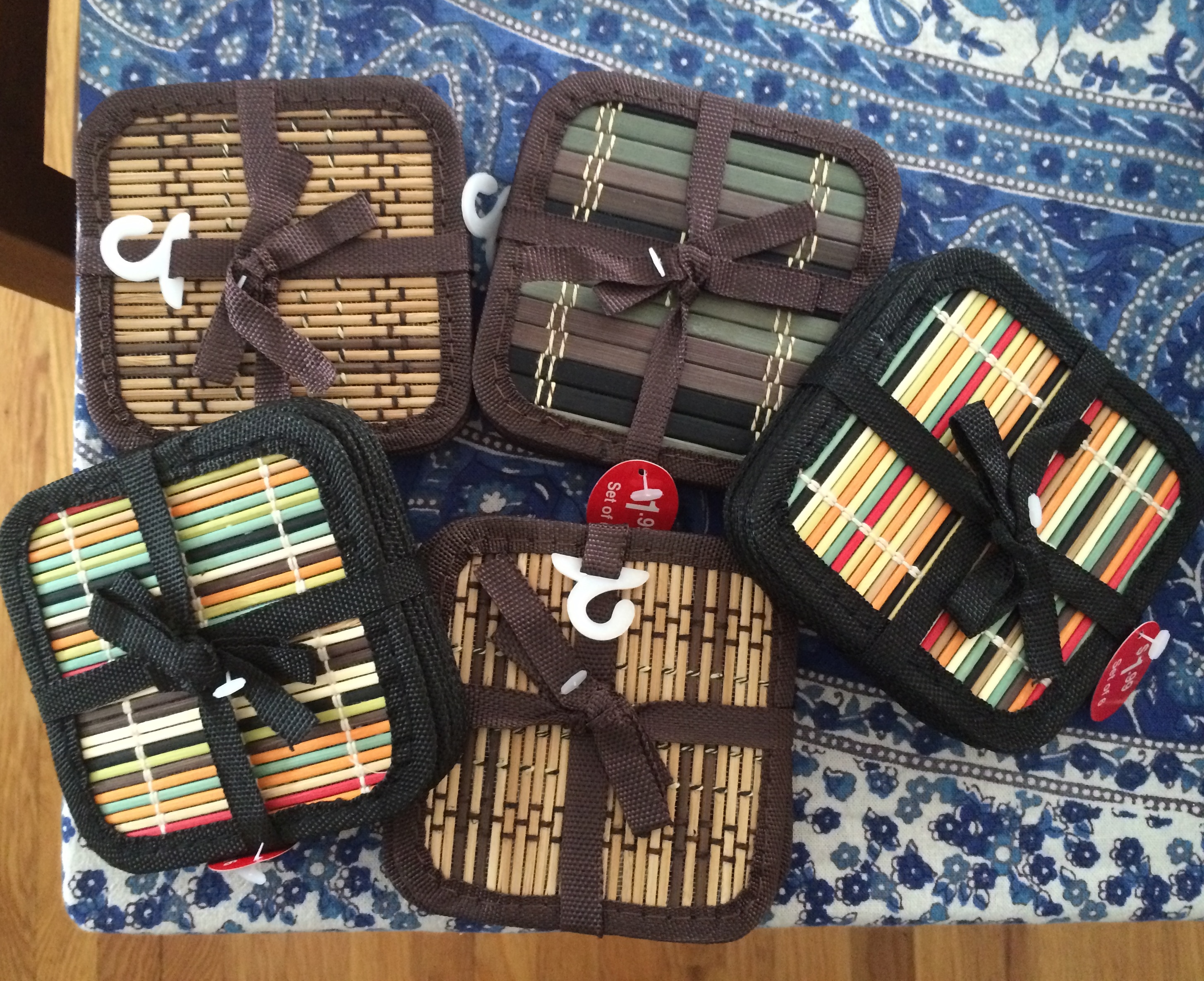 Inspired by woven bamboo shades like these and these, I decided to make my own for my mini house. When I saw these inexpensive coasters at Bed Bath and Beyond I knew I’d found my perfect materials.