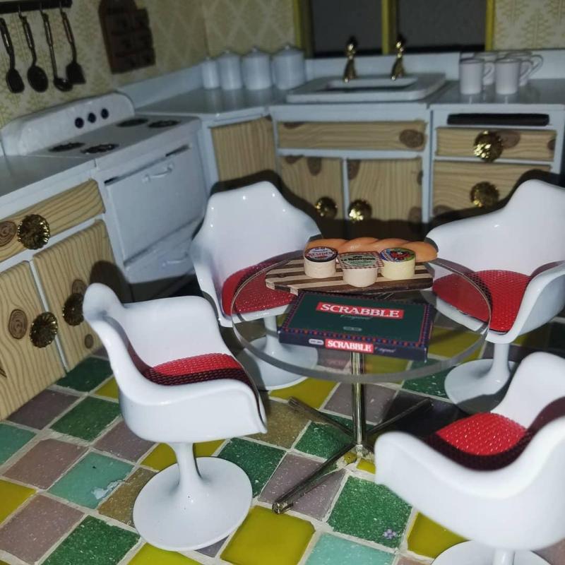 I made much of the furniture and accessories for this dollhouse from found objects, created small-scale rugs, blankets, wall-hangings, and paintings, and altered store-bought dollhouse furniture, resulting in an artistic completely one-of-a-kind finished product.