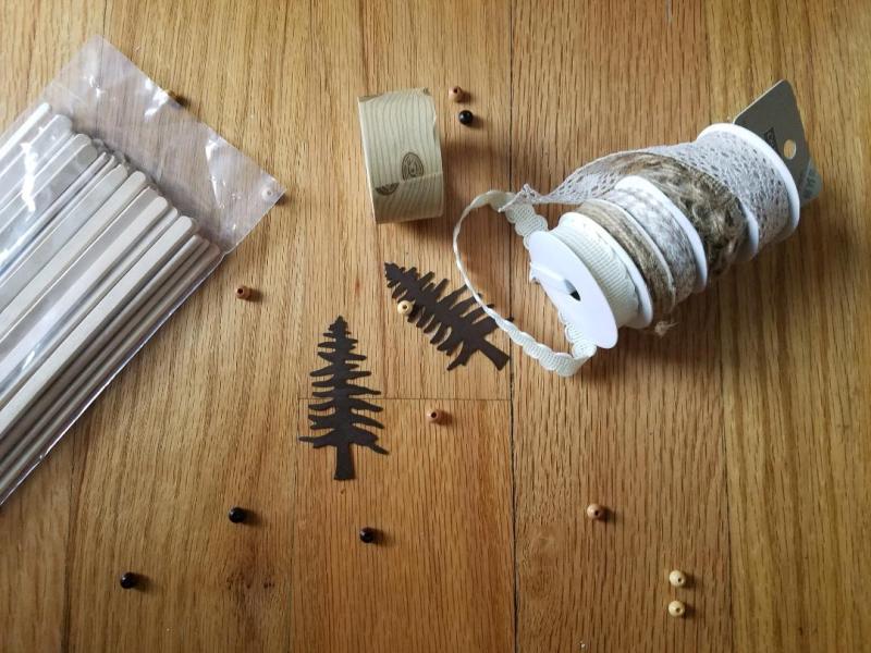 Using some black paint (and a piece of junk mail as my workspace), I outlined three of the trimmed-down tags. After they dried I used double-side tape to affix them to the wall.