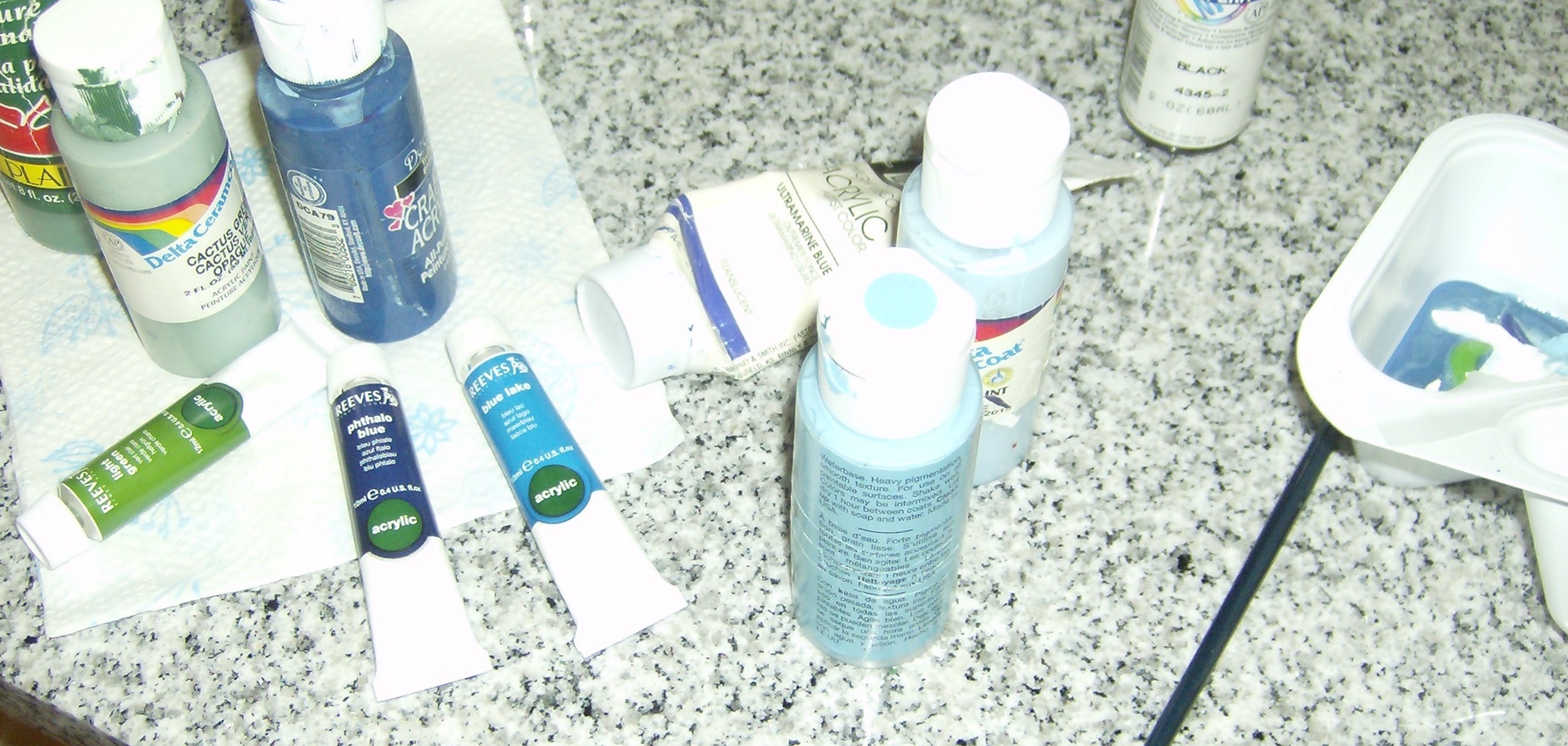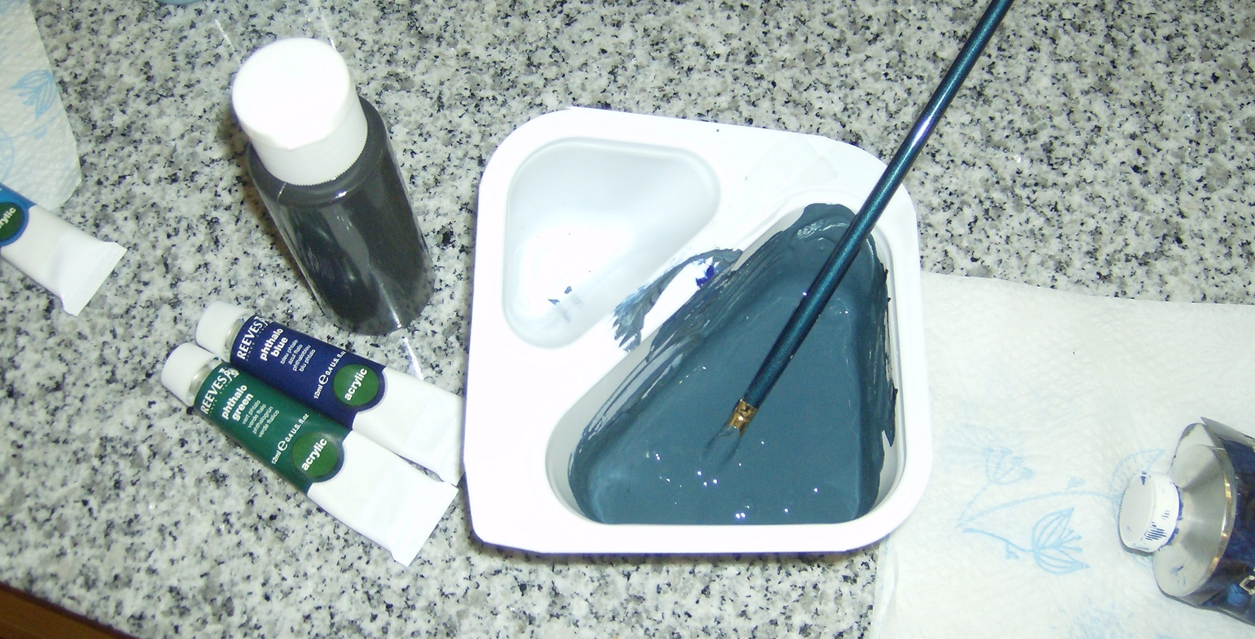 A decision has been made. After much hemming and hawing, I’ve chosen this shade of deep teal and given my house its first coat of paint. To get the perfect shade, I mixed it myself using a variety of tubes and bottles of art and craft paint. Here is a little peek at the secret formula: