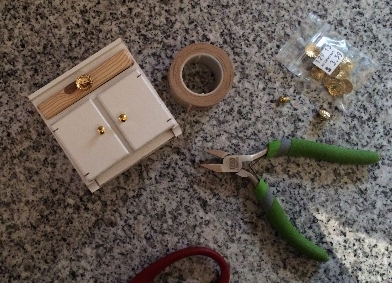 The dresser, cabinet, and small table (night stand) were all Dollar Store purchases or from the dollar (or so) aisle of one of my local craft stores. All were originally unpainted. The dresser and night stand have non-functioning drawers, unfortunately.