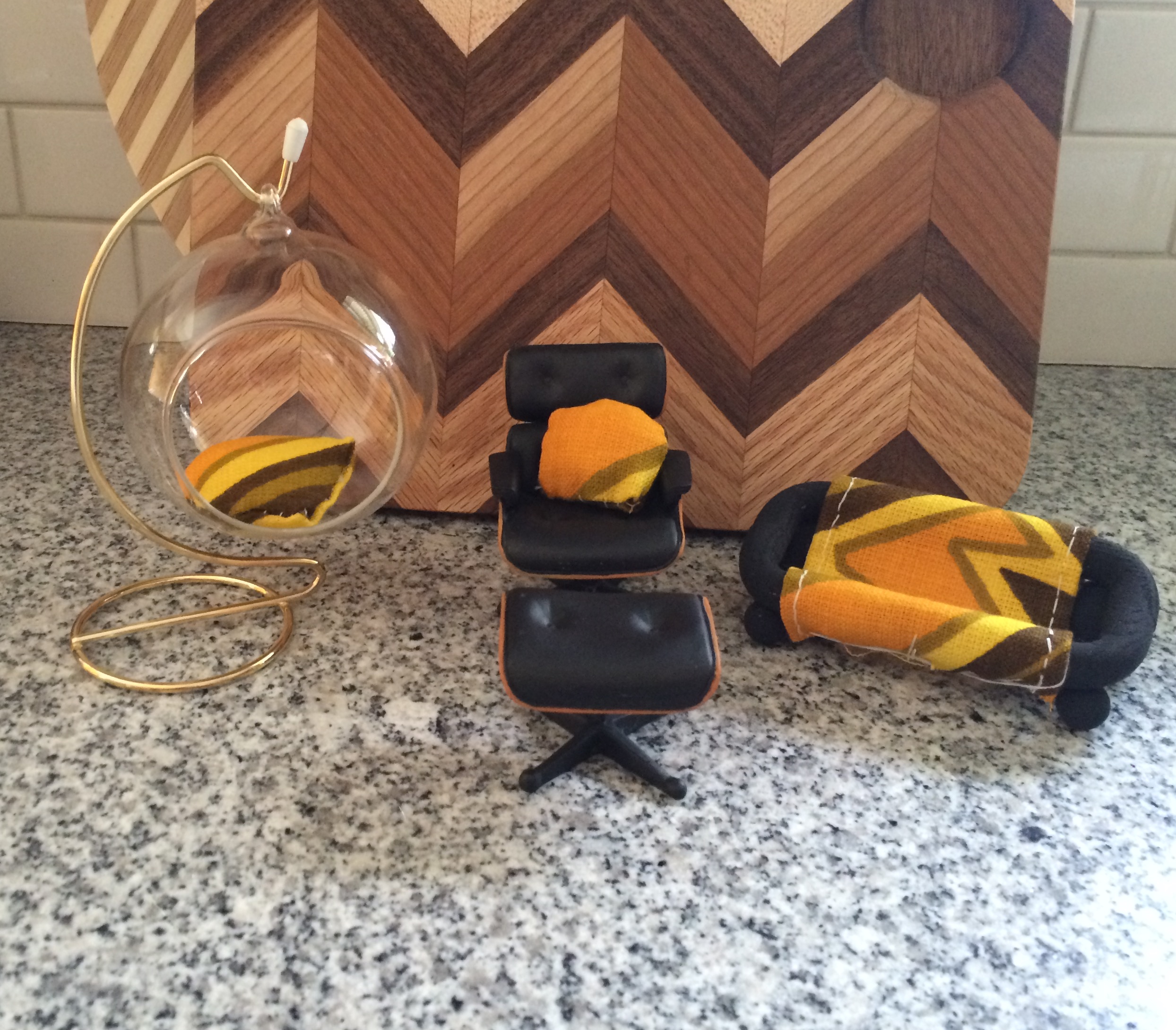 Cup holder + glass ornament = perfect 1:12 scale mid century bubble chair! Photos by Holly Tierney-Bedord. All rights reserved.